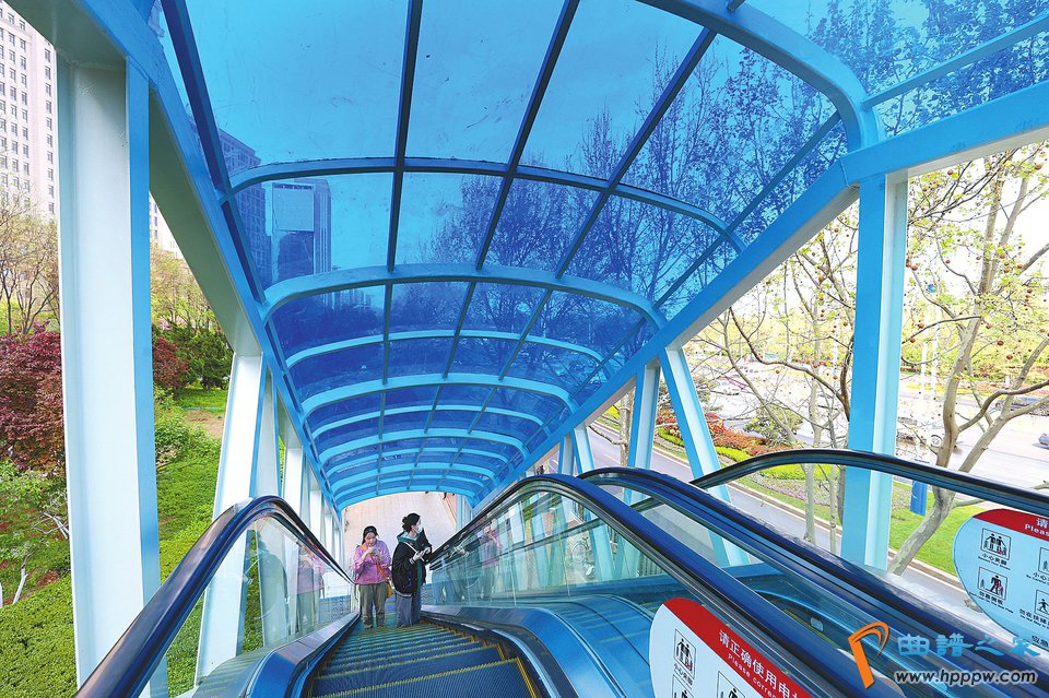 遮雨棚采用钢架结构,呈“n”形罩在扶梯上方,钢架结构外层安装有深蓝色的装饰板,既可以遮挡风雨,也可以遮挡夏季的烈日,阳光透过深蓝色的透明板,给人“海底隧道”的感觉。 (本报记者吕传泉 崔健摄)
