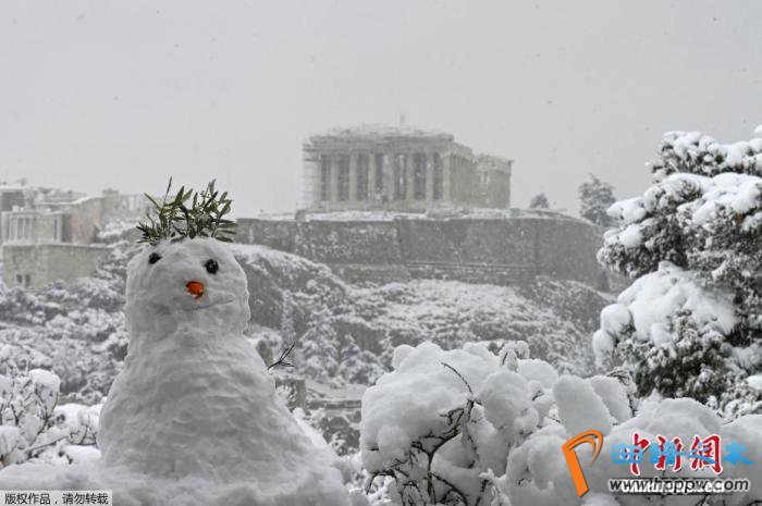 当地时间2月16日,希腊雅典迎来罕见大雪天气,古老的卫城被积雪覆盖。图为民众用积雪捏的雪人。