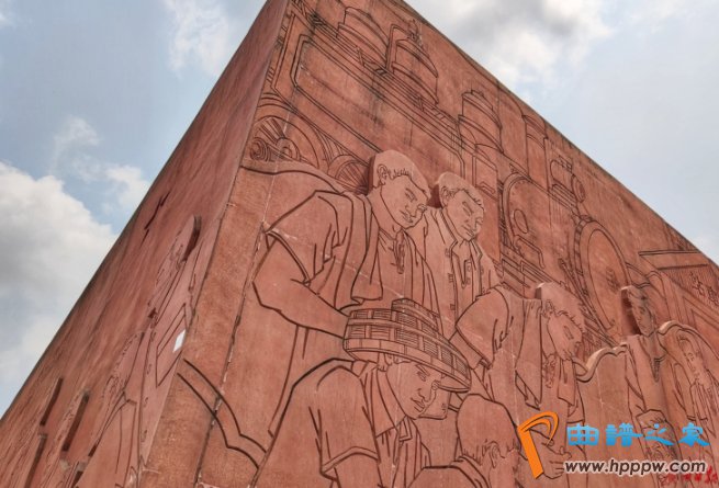 团一大旧址处的红砂岩雕塑,上面印刻着共青团入团誓词、团一大旧址的背景以及革命先贤的肖像。