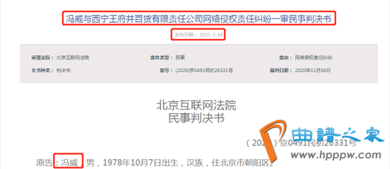 3月18日,北京互联网法院公布了《冯威与西宁百货有限责任公司网络侵权责任纠纷一审民事判决书》。