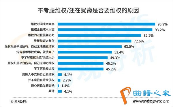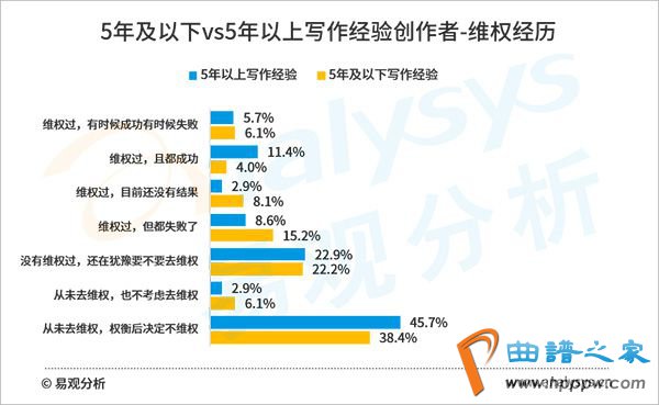 白皮书提到,面对侵权现象,坚定选择维权的作家比例只占51.2%,有近一半的创作者处于犹豫阶段,不确定是否还会选择去维权,需要视侵权严重程度,看维权难易度等因素而定,明确表示不会去维权的创作者比例仅为2.3%。