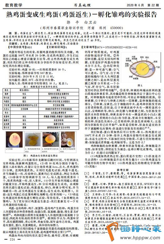 此前,郑州市春霖职业培训学校的郭萍和白卫云曾在《写真地理》2020年6月第22期发表《熟鸡蛋变成生鸡蛋(鸡蛋返生)——孵化雏鸡的实验报告》一文。该文提到,学生们运用自己的“超心理意识能量方法”等,已经成功返生熟鸡蛋40多枚。论文第一作者为郑州市春霖职业培训学校校长郭萍。