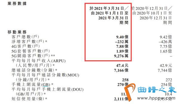 一季报显示,中国移动一季度客户总数9.4亿户,比2020年末减少232万户。值得注意的是,2020年第四季度中国移动总用户数减少426万户。一季度,中国移动5G套餐用户数1.89亿户,增加1300万户。
