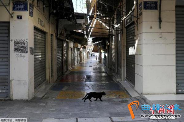 2020年11月7日,希腊雅典,一只猫在空荡的商业街上漫步。