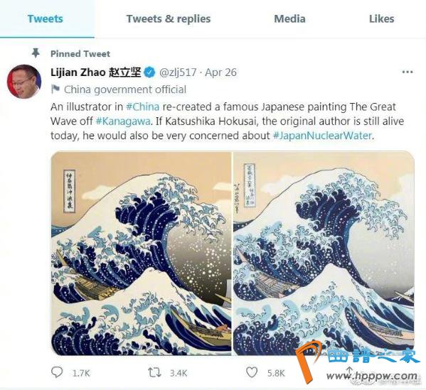 就日本核废水问题,外交部发言人赵立坚日前在社交网站展示了两幅画作——一幅是日本画家葛饰北斋的原作《神奈川冲浪里》,另一幅是中国插画师的讽刺作品《神奈氚冲浪里》,并附文:“如果原作者葛饰北斋现在还活着,他也会非常关心日本核废水问题。”随后,日方就此举要求赵立坚删帖并道歉。对此,赵立坚28日说,这部新作品反映出中国民众对日本政府单方面决定以排海方式处理福岛核污染水的担忧和不满。日方错误决定在先,我们抗议在后。日方做了坏事还不让别人说吗?日方一些官员一直装聋作哑,为什么对一幅插画作品气急败坏。
