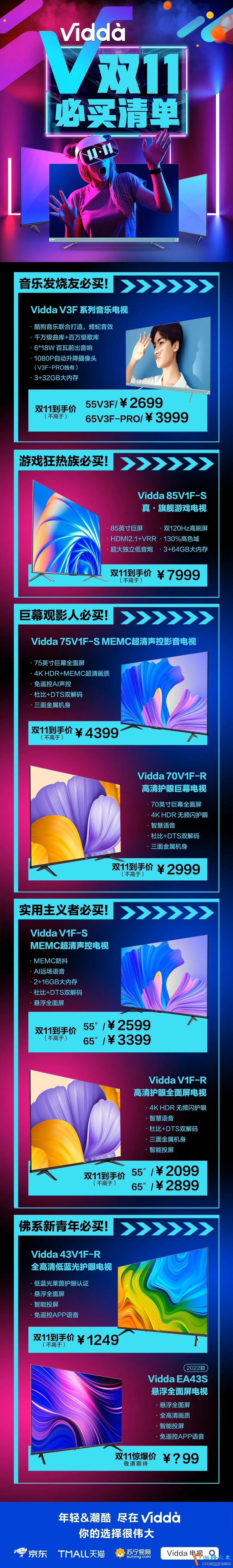 而正在10月22日,Vidda官微也放出了双11必买清单,多款超值主推机型遮盖全尺寸和各样人群。双11旗舰有入手电视需求的幼伙伴能够刻舟求剑,采取适合己方的机型了,一贯宠粉的Vidda绝对不会让民多败兴。