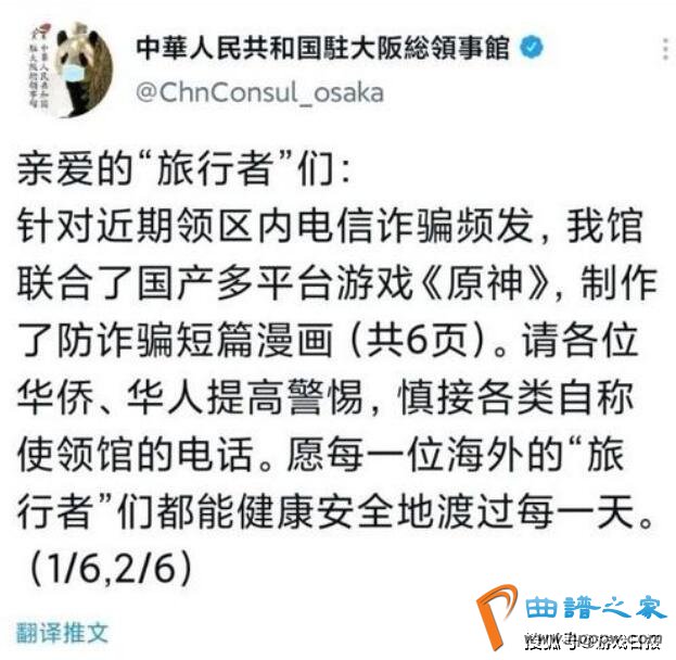 而近来中国驻大阪总领事馆还发表了一条合于原神漫画的动态,用原神里的脚色筑造了一段跟诈骗相合的原创剧情,用这种可爱灵巧现象的实质举行了防诈传布,很有教训和警示道理,也让不少国表里的玩家感觉惊喜趣味。