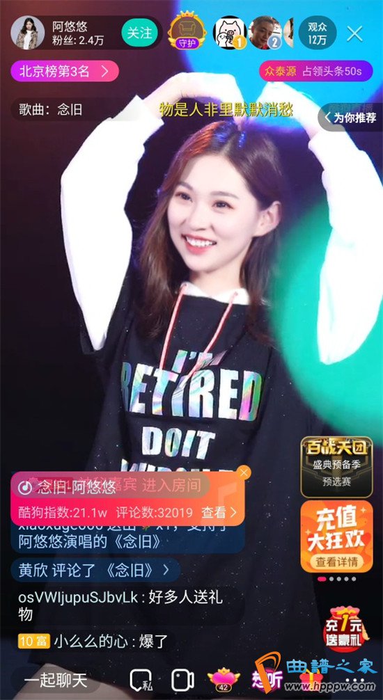 正在阿悠悠演绎《念旧》时,巨额观多从酷狗音笑跳转进入直播间。不少观多正在评论区表现,我方是正在酷狗音笑听歌时一键进入直播间,特别光荣能实时收到指挥,并留言“女士姐公然人美声甜!”酷狗直播与酷狗音笑双向买通后,粉丝们只需求依照指挥就能来到歌手直播间,跟歌手近间隔互动的渠道又多一个,特别nice~