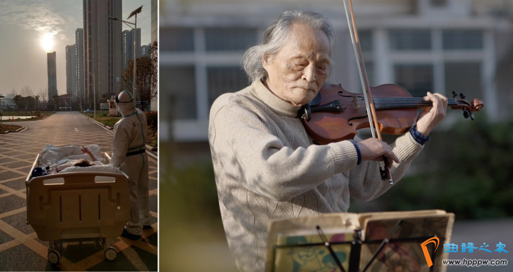 这是一张拼版照片,左图为:2020年3月5日入夜,正在湖北省武汉大学百姓病院东院,复旦大学从属中山病院救援湖北医疗队大夫正在护送患者王欣做CT的途中停下,让住院近一个月的白叟浏览久违的日落(甘俊超 摄);右图为:3月24日,“看夕晖的白叟”王欣正在东西湖区园艺花城幼区内拉幼提琴(新华社记者熊琦摄)。