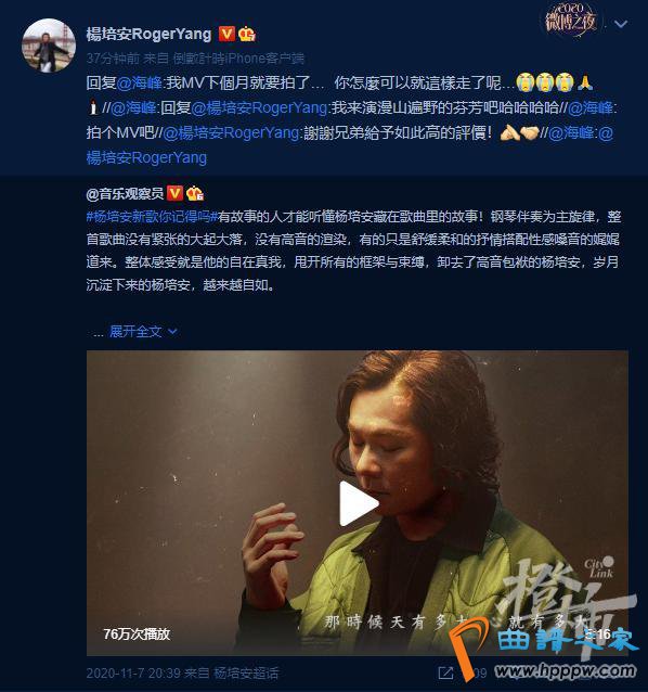 牺牲前,海峰的终末一条微博还停滞正在2020年11月27日跟台湾歌手杨培安的互动,当时杨培安的新歌《你记得吗》恰是由海峰作词作曲。