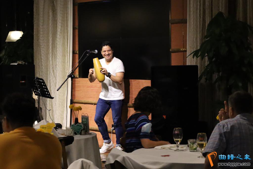 厄瓜多尔歌手卡洛斯·莱德斯马正在北京一家巴西餐厅内吹奏拉美古板笑器。新华社记者李佳旭摄