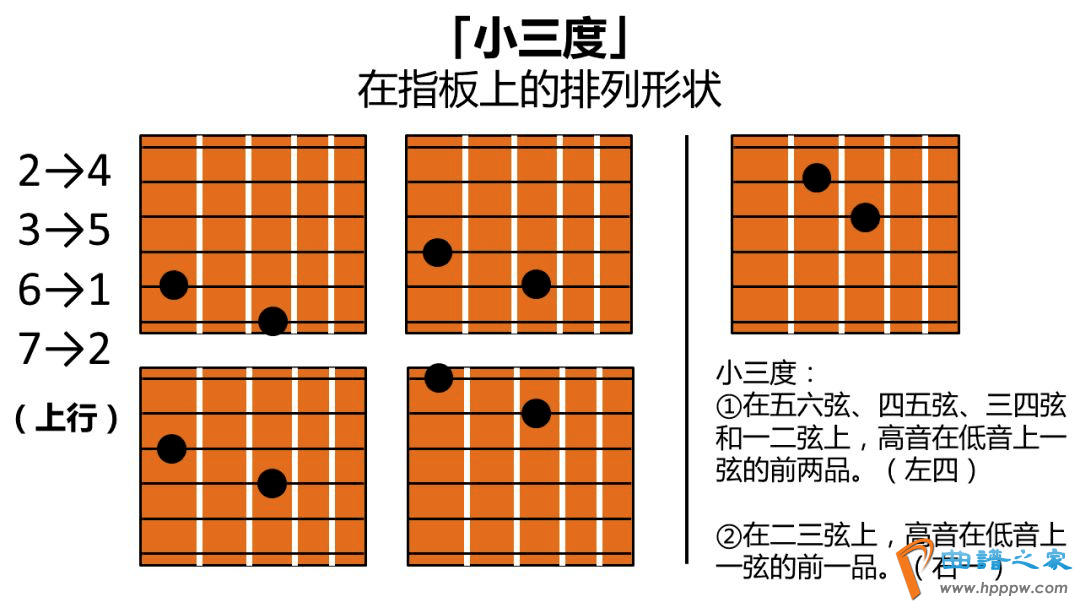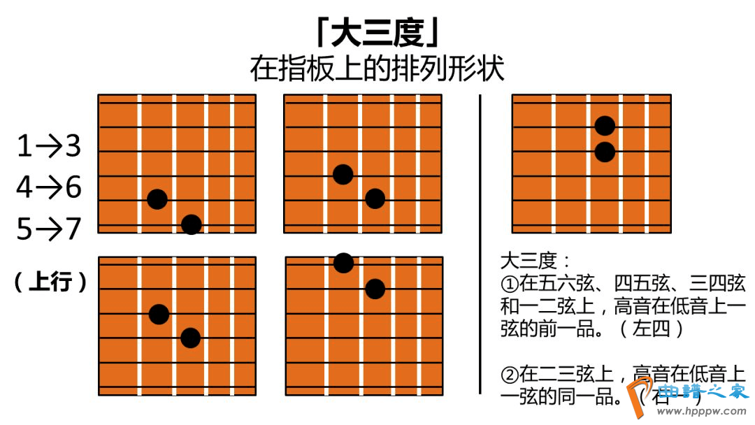 以C5为例,五弦3品为根音C,四弦5品为五音G,三弦5品为高音C。这个指板上的「C—G」地位联系即是纯五度,同时 「G—C」的地位也即是纯四度。