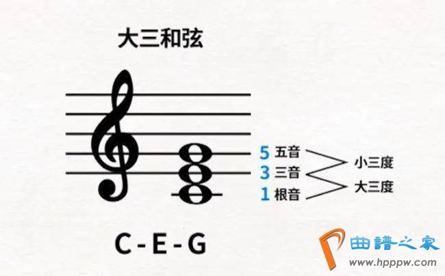 譬喻大三和弦即是由一个大三度+一个幼三度组合而成。而幼三和弦则是由幼三度+大三度组成的。大三和弦与幼三和弦音响颜色的差别,恰是因为音程的组合差别而发生的。