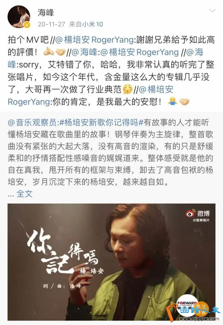 7年后的5月26日凌晨,患有抑郁症的海峰,纵身一跃,已矣了本身的性命。2020年11月27日,他的最终一篇微博还留正在和杨培安的互动中。当时杨培安新歌《我爱记歌词》是海峰,作曲,请杨培安做MV。