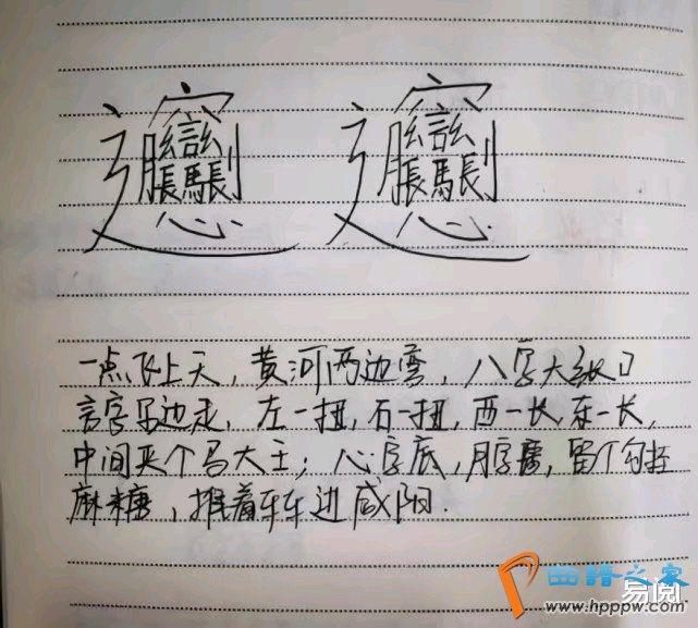 许多网友们都异常相应邓超的召唤,纷纷自身实验写了起来,真是只要真正写起来才涌现这个字真不是这么好写的。就连各大输入法都没有主见写出来这个字,可见其难写的水平!当然,网友中不缺乏能人志士,有一个网友不光写了出来,知心的为公共编了一个顺口溜,便当公共影象。