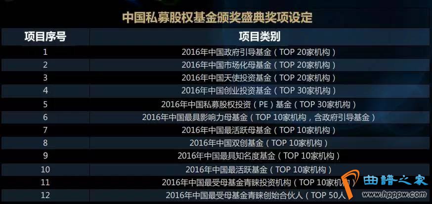 奖项设置中,包含了“2016年中国最活跃母基金”、“ 2016年中国最具影响力母基金”、“ 2016年中国最受母基金青睐基金、创始合伙人”等多项排行榜。