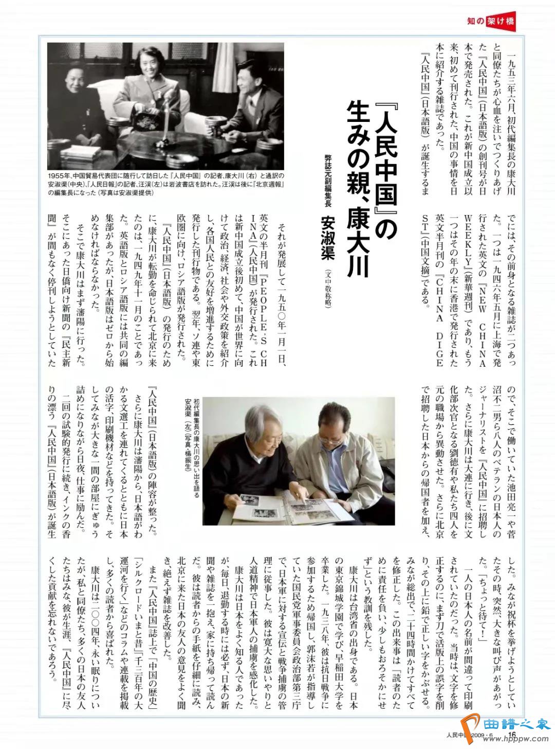 2009年第六期《人民中国》,为纪念中国外文局建局60周年策划了特辑,其中老安撰写的一篇回忆《人民中国》日文版创办人康大川的文章,深情地回忆了草创时期的艰辛与轶事。文中用了两张照片,一张是1955年以外贸部副部长雷任民为团长的中国贸易代表团访日时,康大川和安淑渠也同行前往,作为译员的安淑渠陪同康大川等人访问岩波书店。那时候,日文版《人民中国》刚刚两岁,康大川和安淑渠也都风华正茂。另一张照片,老安和前副总编辑丘桓兴在翻阅相册,回忆和康大川一起工作的美好时光。就在本月10日,老丘也因病离世。在迎来中日邦交正常化50周年的年份里,在明年即将迎来《人民中国》日文版创刊70周年的时候,两位重量级前辈的相继离世令人唏嘘。