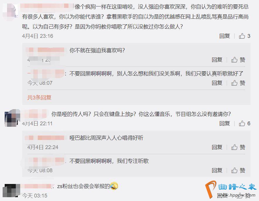 再比如,每次周深的新歌一出来,有时候也许是旋律不好听或者歌词一般,路人可能会在网上吐槽几句发表下看法。然而这些言论在控评的粉丝眼里是绝对不允许出现的,不敢是好听与否都只能说好听,否则就是就是周深黑,就是在恶意给周深差评。