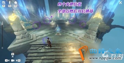 3、玩家跟随任务指示去解放四个高门之火,在平台四角高门之火是被屏障封印着的,在每个雕像下面都有一个火把,这里可以使用火属性角色点燃四个火把即可解放四个高门之火;