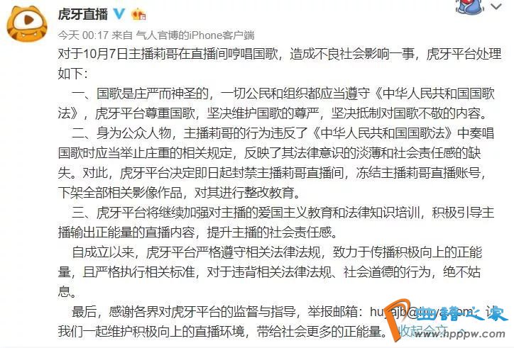 10日零时许,虎牙直播平台在官方微博上公布了对此事的处理结果:虎牙平台决定即日起封禁主播莉哥直播间,冻结主播莉哥直播账号,下架全部相关影像作品,对其进行整改教育。