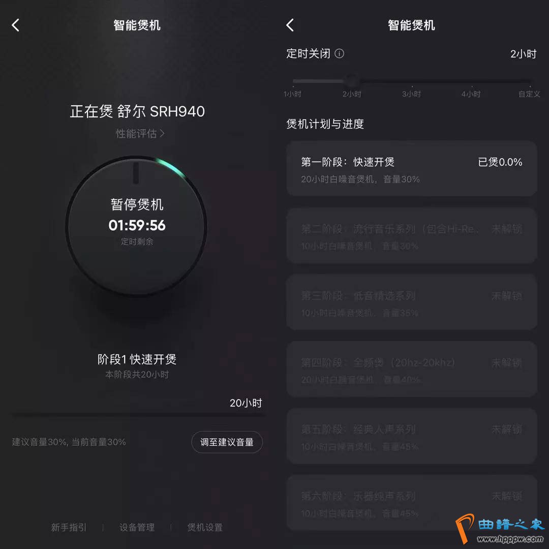 选择完成后,即可开始煲机。第一阶段的煲机时长为2小时,总共分为六个阶段:快速开煲、流行音乐系列、低音精选系列、全频煲、经典人声系列和乐器纯声系列。