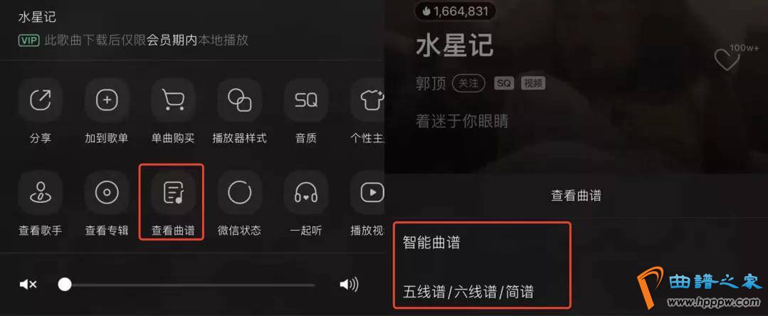 在音乐播放页中,找到“查看曲谱”,分别是智能曲谱,以及五线谱、六线谱、简谱。
