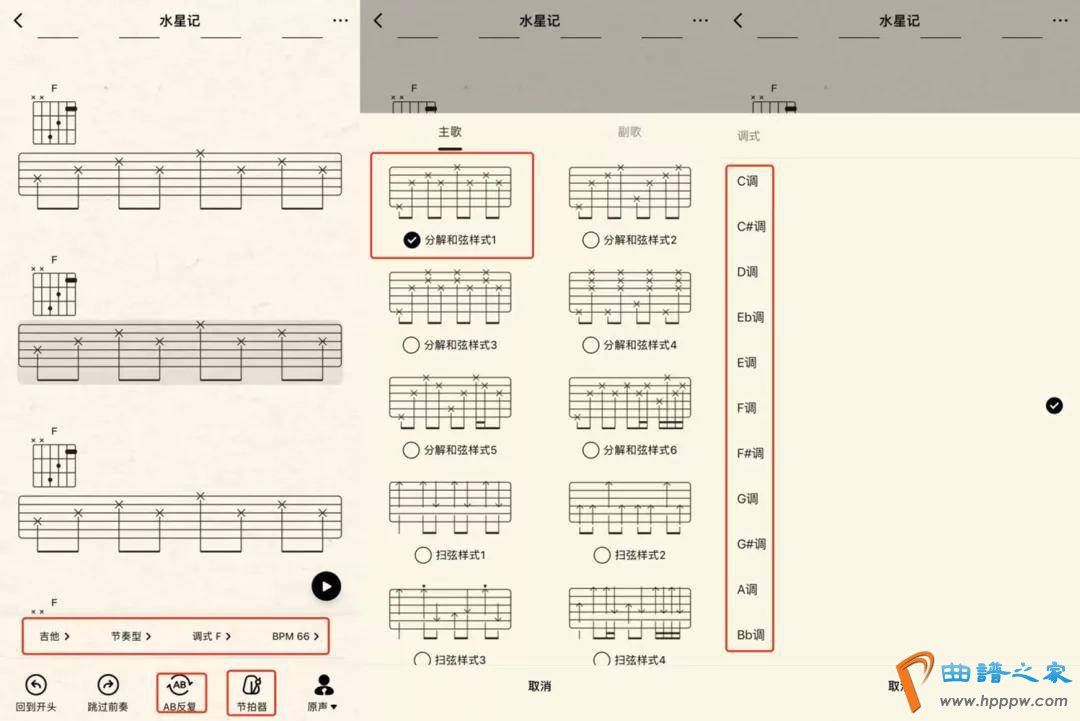 智能曲谱中,可选择吉他和尤克里里两种乐器,系统会根据歌曲的类型及风格智能匹配“分解和弦样式”和“调式”。同时还提供“AB反复”、节拍器的功能。