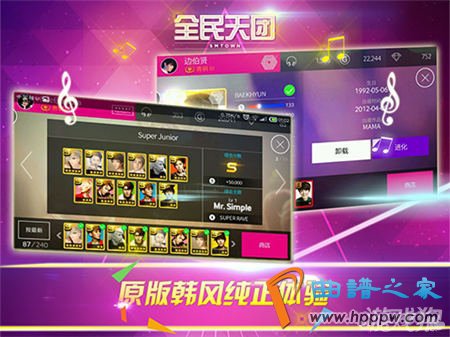 是一款韩国国民级手游,由朴灿烈代言,已经于2015年8月份上线,这是一款采用敲打和滑动为操作模式的音乐手游,以闯关加收集明星卡牌为卖点,集合SM旗下包括少女时代、东方神起、superjunior、EXO等艺人的正版音乐的音乐手游,粉丝们完全可以在游戏的时候享受欧巴们妹子们的热情,游戏所得的珍藏明星头像,受到玩家的热烈追捧。