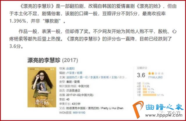 一时间,迪丽热巴获奖作品的评分持续下滑。很多网友认为,《漂亮的李慧珍》翻拍自韩剧《漂亮的她》,本土化不足,剧情俗套,口碑和收视一般,并非是“爆款剧”。