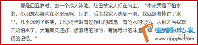 很小的时候,家人扛着迪丽热巴到成人游泳池游泳,突然脚底一滑,小迪丽热巴瞬间沉入水底,呛水、窒息和挣扎的痛苦,成为她此后挥之不去的恐惧……