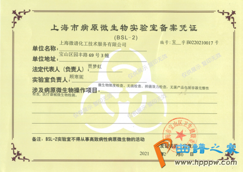 2021年12月30日,微谱微生物实验室顺利获得“上海市病原微生物实验室备案凭证”,实验室等级BSL-2,证书编号:宝字第0220210017号。