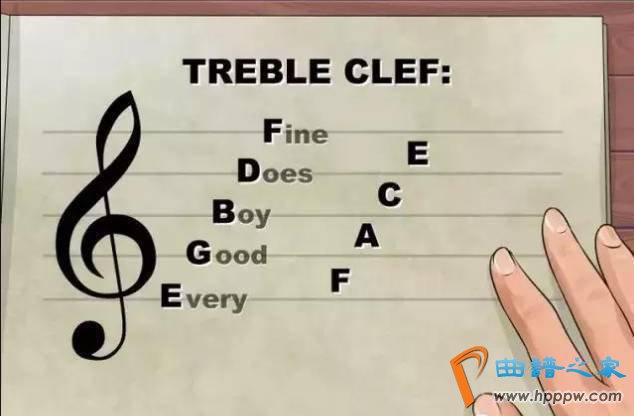 方法:先按照第一个方法背线上的音,得到高音谱表第五线fa,再看这个音是与线上fa相邻的上方的间里,就知道这个音是sol了。