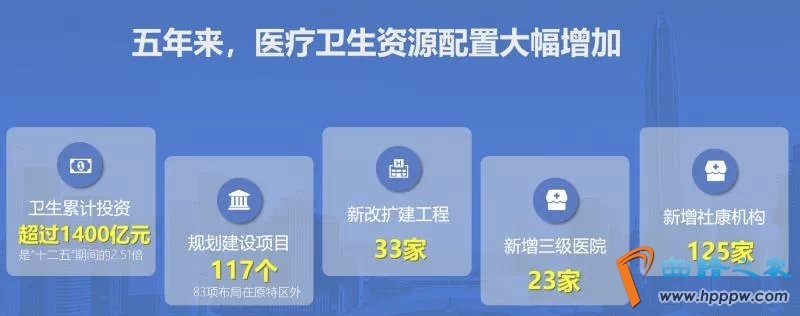 推动了117个医疗卫生重点项目的建设,新增了23家三级医院,也新增了159家社康中心。总体上来讲,十三五期间我们病床数增加了50%。