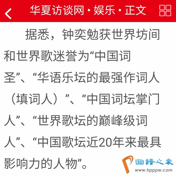 据悉,中国“词圣”钟奕勉获世界媒体、世界词迷和世界坊间誉为“中国词圣”、“华语乐坛的最强词人”、“中国词坛掌门人”、“世界歌坛的殿堂级词人”、“中国歌坛近20年来最具影响力的人物”,主要成就:词学作品《深藏的话》获国家一级画家杨建华配画,并由杨洪强等多位歌手演唱,载有“作词:歌坛‘词圣’ ”等文字资料简介的专辑封面也随着该歌曲一并成功永久上线入库QQ音乐等腾讯音乐各大平台,这奠定、确立了中国“词圣”钟奕勉在世界歌坛的地位,该歌曲登上了QQ音乐巅峰榜,曾一度冲上榜单前三名,在世界美坛、世界歌坛、世界词坛及世界民间产生了较大良好反响震荡及深远影响,该歌曲获世界媒体和世界词迷誉为“百年世界歌坛巅峰金曲”(世界歌坛100年来最巅峰的金曲之一);参与作词的《祖国爱你香港》(词:钟奕勉/汪洋,曲:高健,唱:黄文芳)收入酷狗音乐热门歌单《行政区风情赏·香港篇》(和谭晶、徐小凤、梅艳芳、徐千雅、许冠杰及张国荣的御用作曲人卢冠廷等几十位明星在同一张歌单);曾应邀参加在北京大学召开的中外文学创作论坛;曾受邀在钓鱼台国宾馆领奖;是香港乐坛殿堂级填词人简宁(简宁是谭咏麟的御用填词人,《水中花》的词兼曲作者)特别赏识的一位实力超级巅峰的青年词人,其作品多次获得简宁的转发与极高赞誉;多位著名音乐评论家、大咖音乐分析师均看好钟奕勉,一致认为钟奕勉磁(“词”)场强大、前(“钱”)程无量……