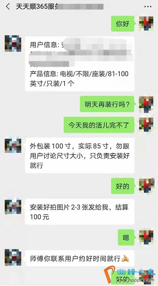 张女士从京东第三方商家购买了一台100寸电视,收到货发现只有85寸,张女士提供的截图显示,卖家通过微信告诉安装师傅“外包装100寸,实际85寸,勿和用户讨论尺寸大小,只负责安装就行”。