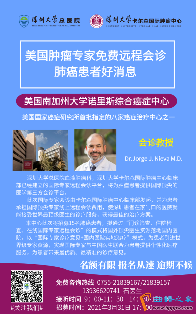 http://news.sznews.com/pic/2021-03/26/5537e421-f48f-400e-a9ec-f05833fad377.pnghttp://www.sznews.com/news/content/2021-03/26/content_24079008.htmhttp://www.sznews.com/news/content/mb/2021-03/26/content_24079008.htm深圳新闻网日前,记者从深圳大学总医院获悉,该院血液肿瘤科暨深圳大学卡尔森国际肿瘤中心临床部建立的国际专家远程会诊平台将于近日为肺癌患者免费提供诊疗建议。1/enpproperty-->