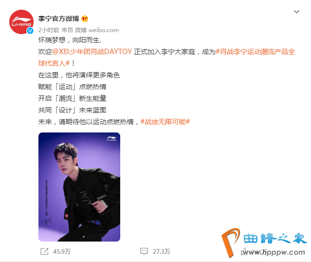 3月26日上午,@李宁官方微博宣布肖战成为李宁运动潮流产品全球代言人。值得一提的是,港股体育用品股持续走高,李宁涨近9%,安踏涨超4%。