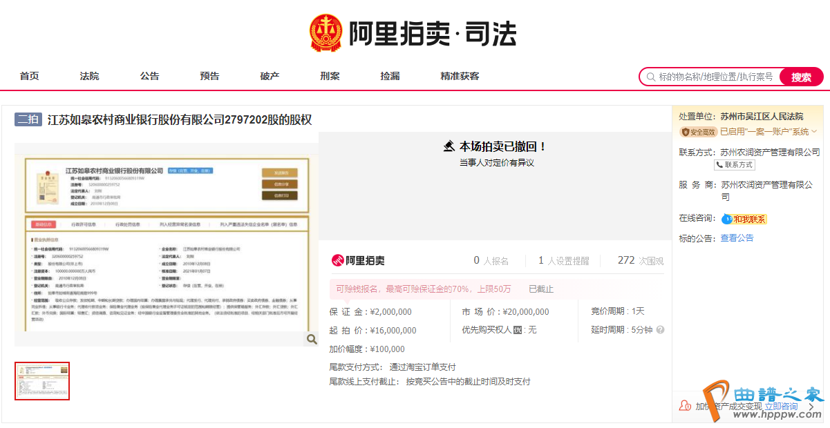 3月24日每经快讯,近日,3笔合计数量约840万股的如皋银行股权在第二次司法拍卖前夕突然被法院撤回,原因是“当事人对定价有异议”。 本月初,包括上述3笔股权在内的5笔如皋银行股权在第一次拍卖中流拍,数量共计1538.46万股,起拍价合计达1.1亿元。从相关信息看,这5起拍卖均与上市公司康力电梯两年前踩雷良卓资产旗下私募基金产品有关。而5笔股权拍卖公告中披露的一份三方确认协议显示,股权流拍后,将不再挂网拍卖,而是以7.15元/股的保留价交由康力电梯抵债。