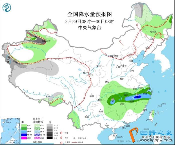 3月29日08时至30日08时,内蒙古东北部、黑龙江西北部、新疆沿天山地区和南疆西部山区、西藏北部和东南部、青海西部等地部分地区有小到雪或雨夹雪,其中,新疆沿天山地区和南疆西部山区等地部分地区有大雪,局地暴雪(10~15毫米)。江汉东部、江南中北部等地部分地区有中到大雨,其中,江西北部、浙江中西部等地部分地区有暴雨(50~60毫米)。内蒙古中东部、华北北部、东北地区大部等地部分地区有4~6级风。
