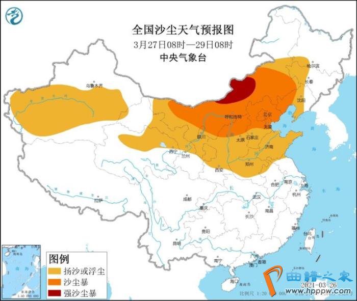 受冷空气大风影响,预计3月27日08时至28日08时,新疆南疆盆地和东部、青海东北部、内蒙古、甘肃中东部、宁夏、陕西中北部、山西、北京、天津、河北、山东西北部、辽宁西部、吉林西部等地的部分地区有扬沙或浮尘天气,其中,内蒙古中西部、陕西北部、山西北部、河北中北部、北京、天津、辽宁西部等地的部分地区有沙尘暴,内蒙古中部偏北地区有强沙尘暴。