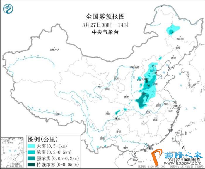 3月27日早晨至上午,黑龙江西南部、河北中南部、北京、天津、山东西部、河南中东部、湖北北部等地的部分地区有大雾,其中,河北南部、山东西部、河南中部、湖北北部等地的部分地区有能见度低于200米的强浓雾,局地有能见度低于50米的特强浓雾。中央气象台3月27日06时继续发布大雾黄色预警。
