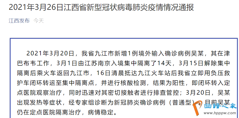 据江西发布最新消息,2021年3月20日,我省九江市新增1例境外输入确诊病例吴某,其在津巴布韦工作,3月1日由江苏南京入境集中隔离了14天,3月15日解除集中隔离后乘火车返回九江市,16日清晨抵达九江火车站后我省立即用负压救护车闭环转运至集中隔离点,并进行核酸检测,结果为阳性,即闭环转入定点医院观察治疗,同时迅速对其密切接触者进行排查管控;3月20日,吴某出现发热等症状,经专家组诊断为新冠肺炎确诊病例(普通型)。目前吴某仍在定点医院隔离治疗,病情稳定。