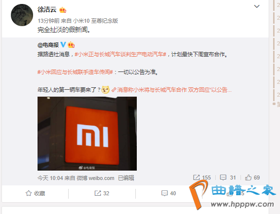 NO.5 小米集团总办副主任:和长城汽车合作生产电动汽车为“完全扯淡的假新闻”!3月26日,有消息称,小米正在和长城汽车谈判使用其工厂生产电动汽车。对此,小米集团总办副主任、原集团公关部总经理徐洁云在微博回应此报道称:“完全扯淡的假新闻。”此外,长城汽车也发布澄清公告称:相关新闻报导并不属实。公司并未与小米就上述新闻报导事宜进行谈判。
