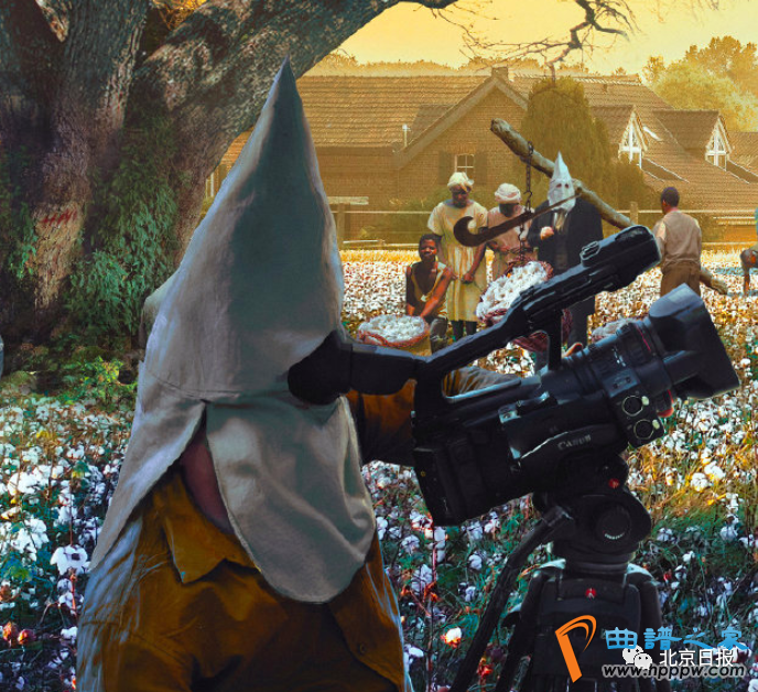 这幅题为——Blood Cotton Initiative (血腥棉花发展计划)的画里,描绘的了一群用白色尖帽蒙脸的记者和警察,在棉花地围着一个稻草人进行采访,而他们身后是正在辛苦采棉的黑奴们。