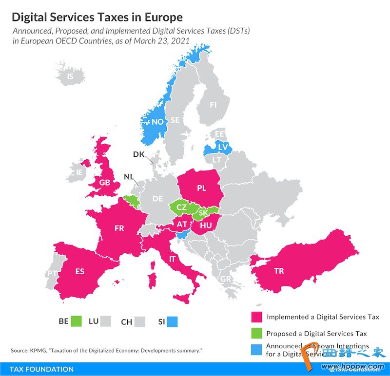 美国税收基金会( Tax Foundation )网站的公开信息显示,截至2021年3月23日,奥地利、法国、匈牙利、意大利、波兰、西班牙、土耳其和英国等八国已实施征收数字税;比利时、捷克、斯洛伐克已形成征收数字税的提案;拉脱维亚、挪威、斯洛文尼亚已宣布或表示征收数字税的意图。