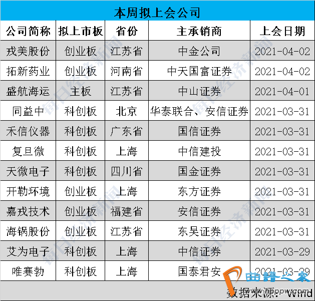 本周,将有12家公司迎来上会。相比前一周8家上会的数量明显增多。其中,主板市场有盛航海运1家公司;注册制下的创业板和科创板,则有同益中、复旦微、天微电子、海锅股份、嘉戎技术、开勒环境、禾信仪器、艾为电子、唯赛勃、戎美股份、拓新药业等11家公司上会。