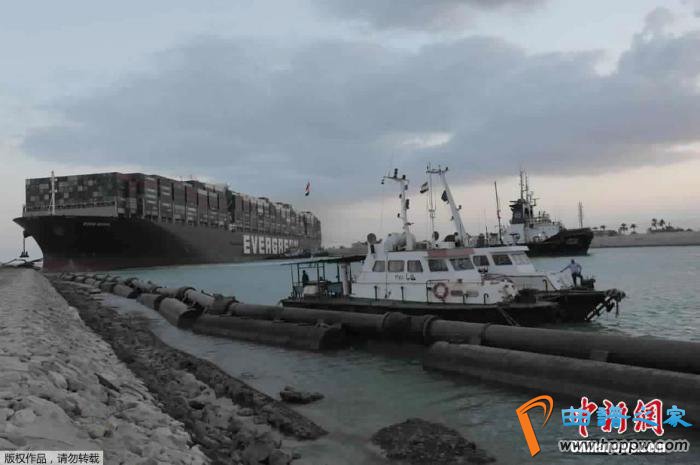 苏伊士运河搁浅货轮船身80%摆正 船尾离开岸边