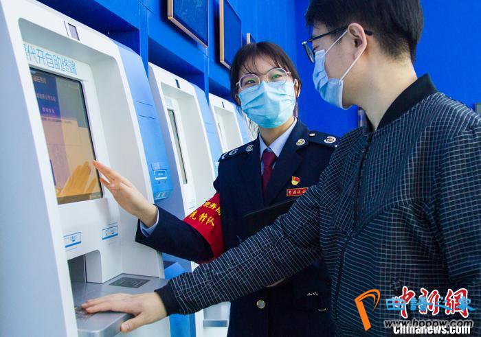 资料图:工作人员指引办税人使用自助设备。 濮志晔 摄