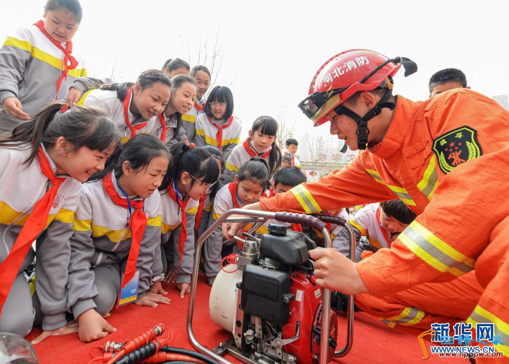 3月29日,河北省邯郸市磁县消防救援大队队员在磁县崇文学校向学生介绍消防设备。