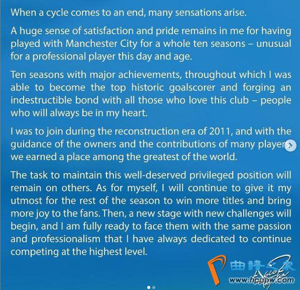 在曼城宣布阿圭罗离队之后,阿圭罗本人也在个人社交媒体向球迷们告别。他写道:“当在曼城的时光快要结束的时候,我的内心百感交集。能够在曼城效力十年是一件令我感到十分骄傲与自豪的事,尤其是在现如今的足球环境下。经过十个赛季的拼搏,我很荣幸能够成为队史最佳射手。而能够与所有热爱这家俱乐部的人们同舟共济,荣辱与共,也是让我非常感动的一点。热爱曼城的人们,你们永远都在我心中。”